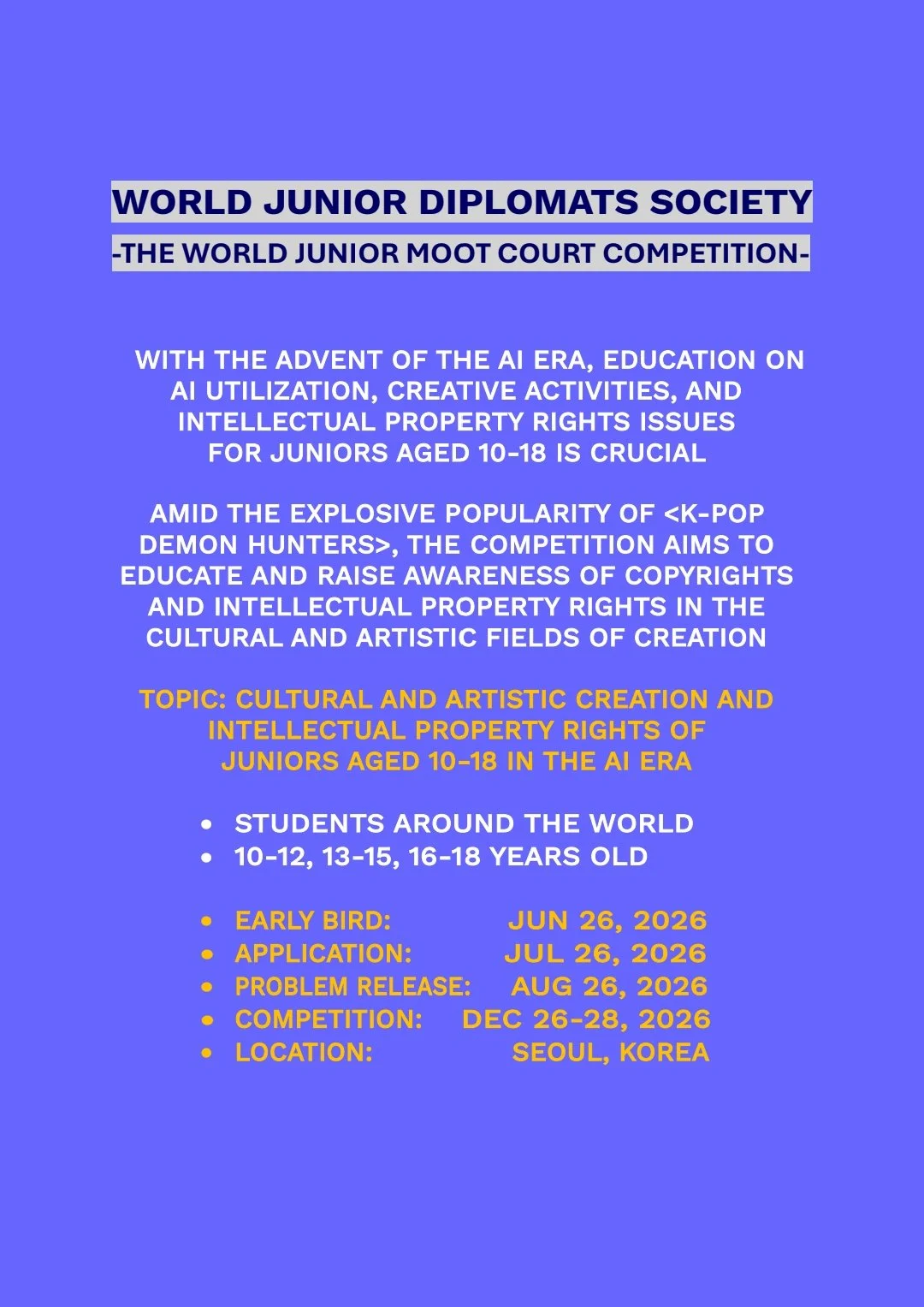 TURNING TODAY'S CULTURAL CREATION TRENDS INTO A PRACTICAL LEARNING PLATFORM WHERE JUNIORS WHO AGED 10-18 DEVELOP ETHICAL AI-USE HABITS AND STRONG INTELLECTUAL PROPERTY AWARENESS WHILE HELPING ASPIRING JUNIOR DIPLOMATS AND LEGAL PROFESSIONALS ENGAGE WITH INTERNATIONAL LAW MORE CONFIDENTLY AND ACCESSIBLY THROUGH AN IMMERSIVE MOOT COURT COMPETITION EXPERIENCE